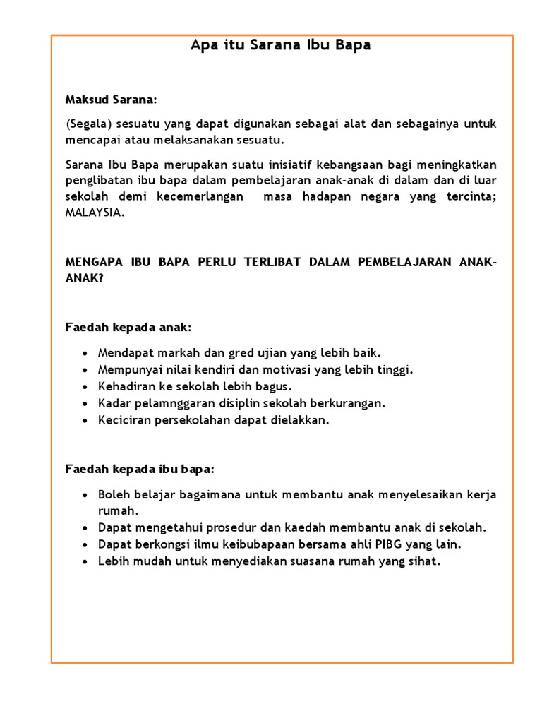 . SARANA IBU BAPA DAN SARANA SEKOLAH PELAN PEMBANGUNAN PENDIDIKAN 2013-2015 KPM. Timbalan Perdana Menteri Tan Sri Muhyiddin Yassin berkata sehingga kini lebih 50 peratus Kumpulan Sokongan Ibu Bapa KSIB di bawah program dua sarana ditubuhkan di seluruh negara. View Academics in Sarana Ibubapa dan Sarana Sekolah on Academiaedu.